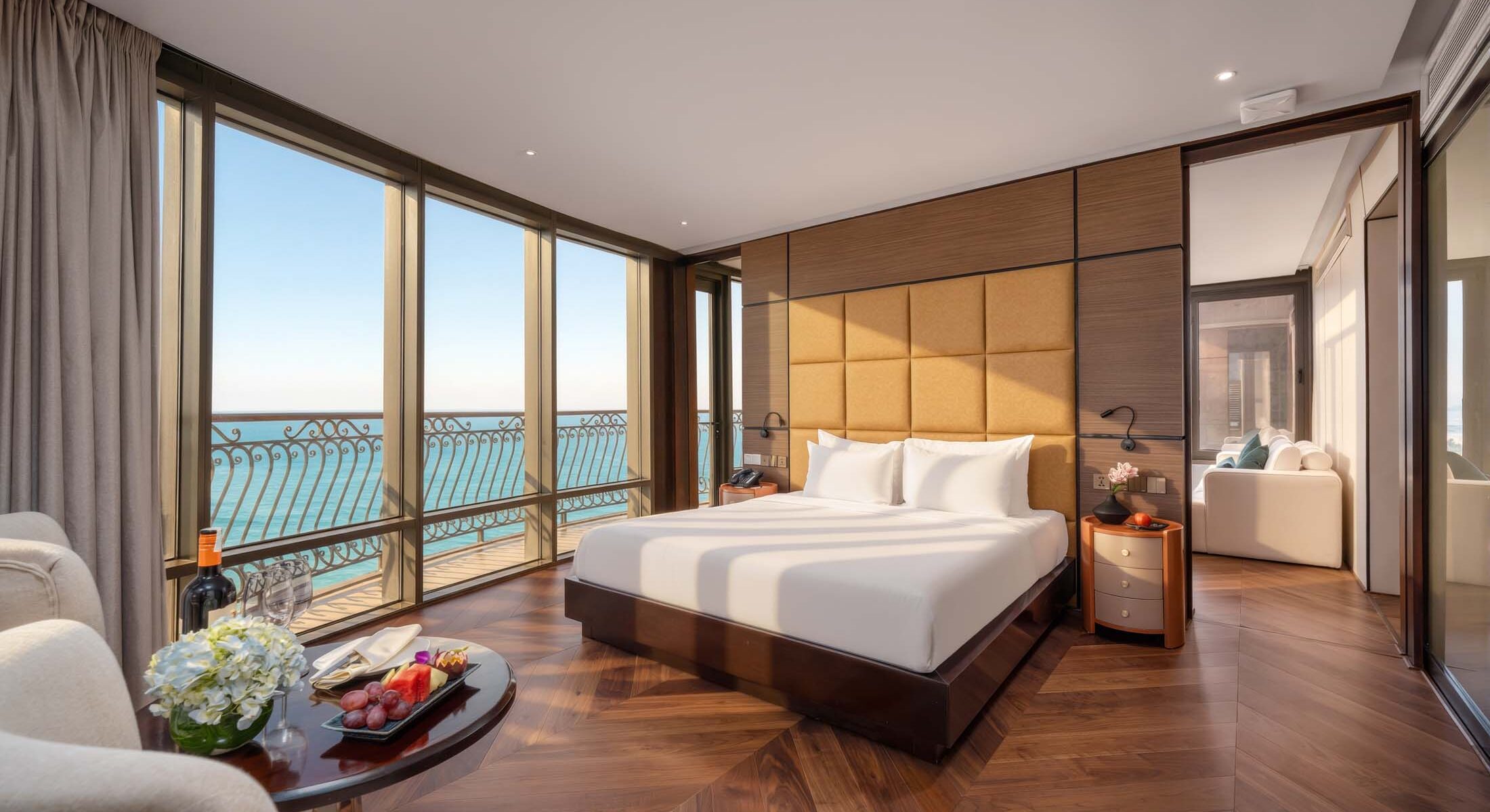 Tỉnh dậy bên mặt biển óng ánh dưới chân trong không gian sống phong cách. Phòng suite rộng rãi với chi tiết gỗ và da mềm mại cao cấp tạo nên một góc yên ả ngày nắng và thanh lịch khi đêm về.